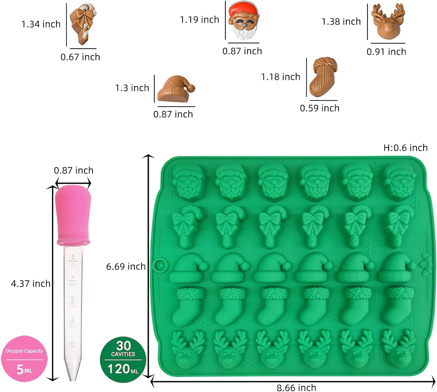 【Measurement】 The silicone Christmas mold is 8.66x 6.69 x 0.6 inch;The Santa Claus size is 1.19 x 0.87 inch; The Christmas hat size is 1.3 x 0.87 inch; The Christmas sock size is 1.18 x 0.59 inch; The deer size is 1.38 x 0.91inch; The Christmas cane size is 1.34 x 0.67 inch.