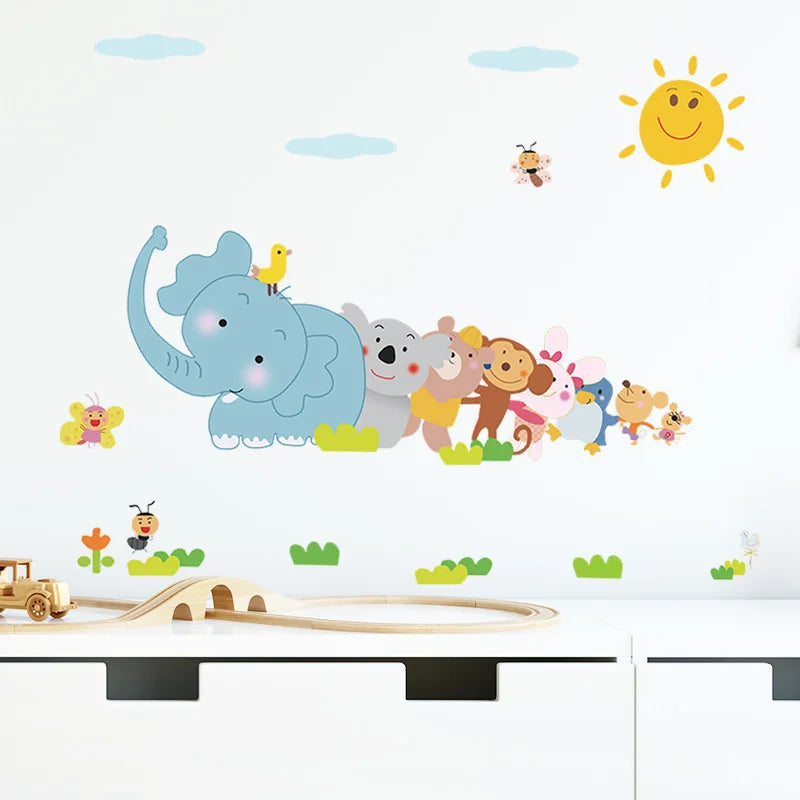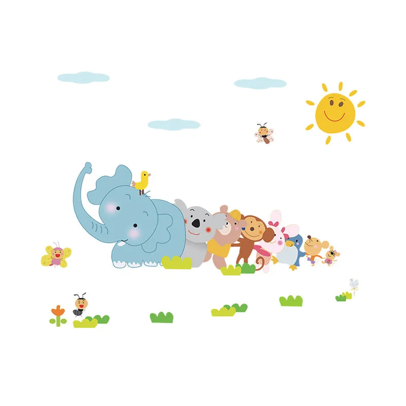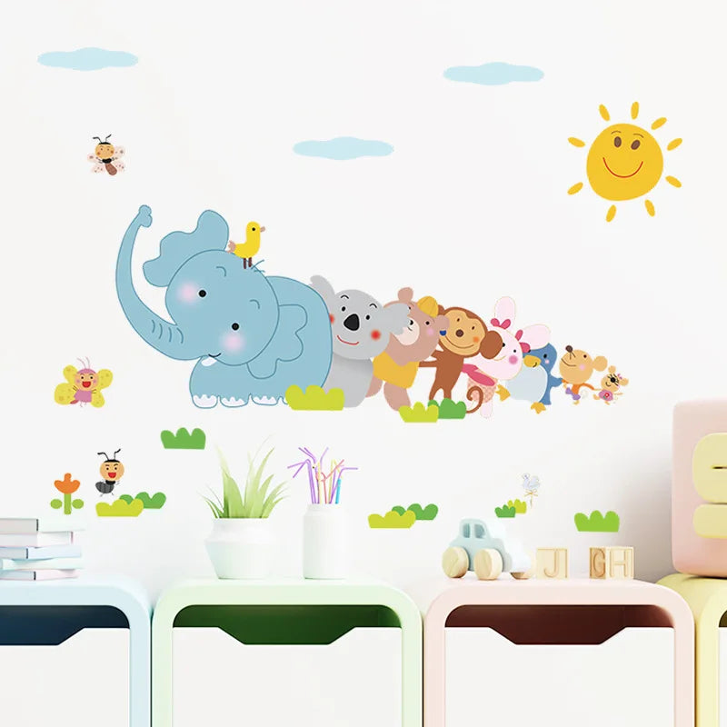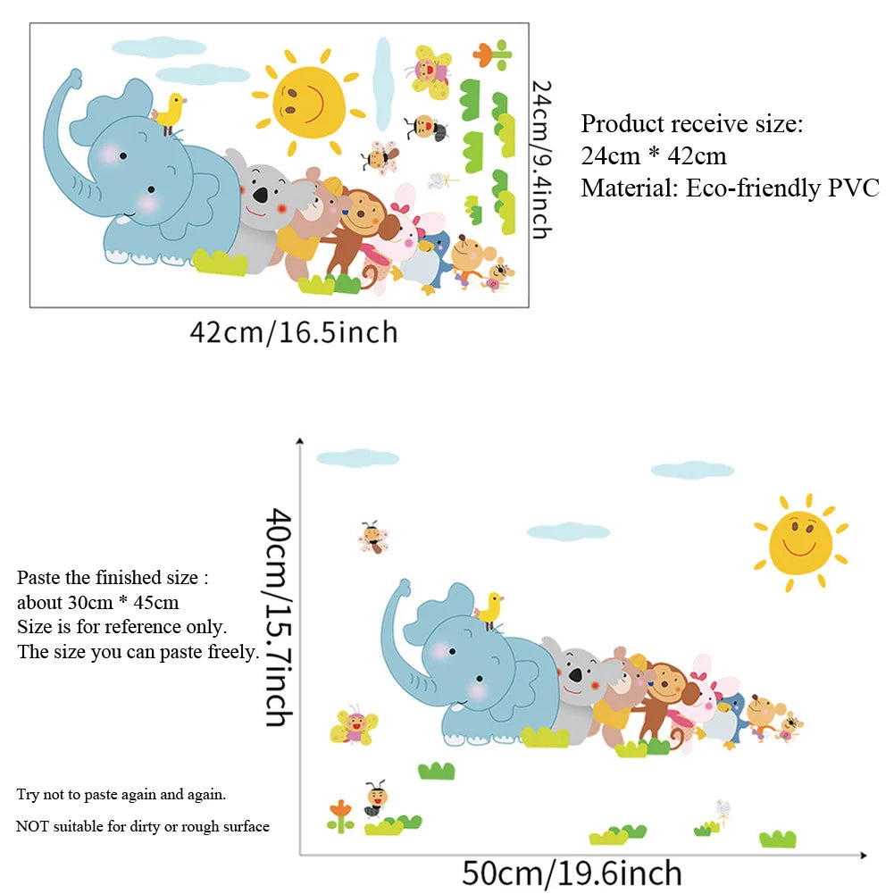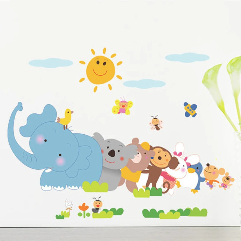 Happy Animals Elephant Monkey Wall Sticker For Kids Room Bedroom Home Decor DIY Art Background Decals Cute Cartoon Zoo Stickers